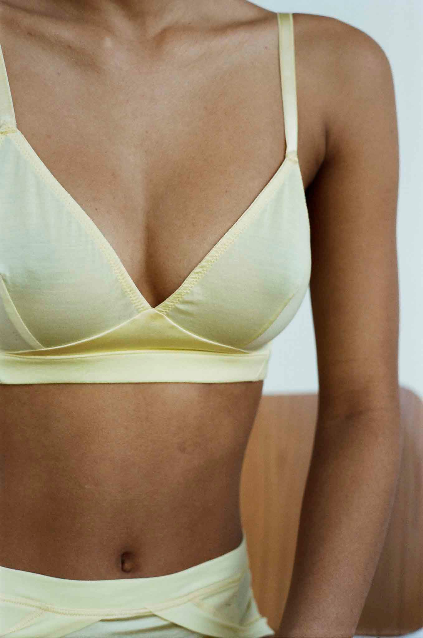 This elegant triangle bra is cut with higher side and back panels for extra support. The single layer 100% cotton cups offer a second skin feel and lightness which is combined with the smooth, finer width under band. The angled side seam structure helps push-in from the sides.